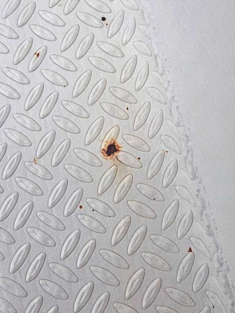 Rostbedingte Verfärbung auf einer strukturierten Pool-Oberfläche infolge metallischer Partikeleinwirkung. Deutlich erkennbar sind lose aufliegende Oxidationsrückstände und die beginnende Pigmentierung des Untergrunds. - © Sascha Hintze