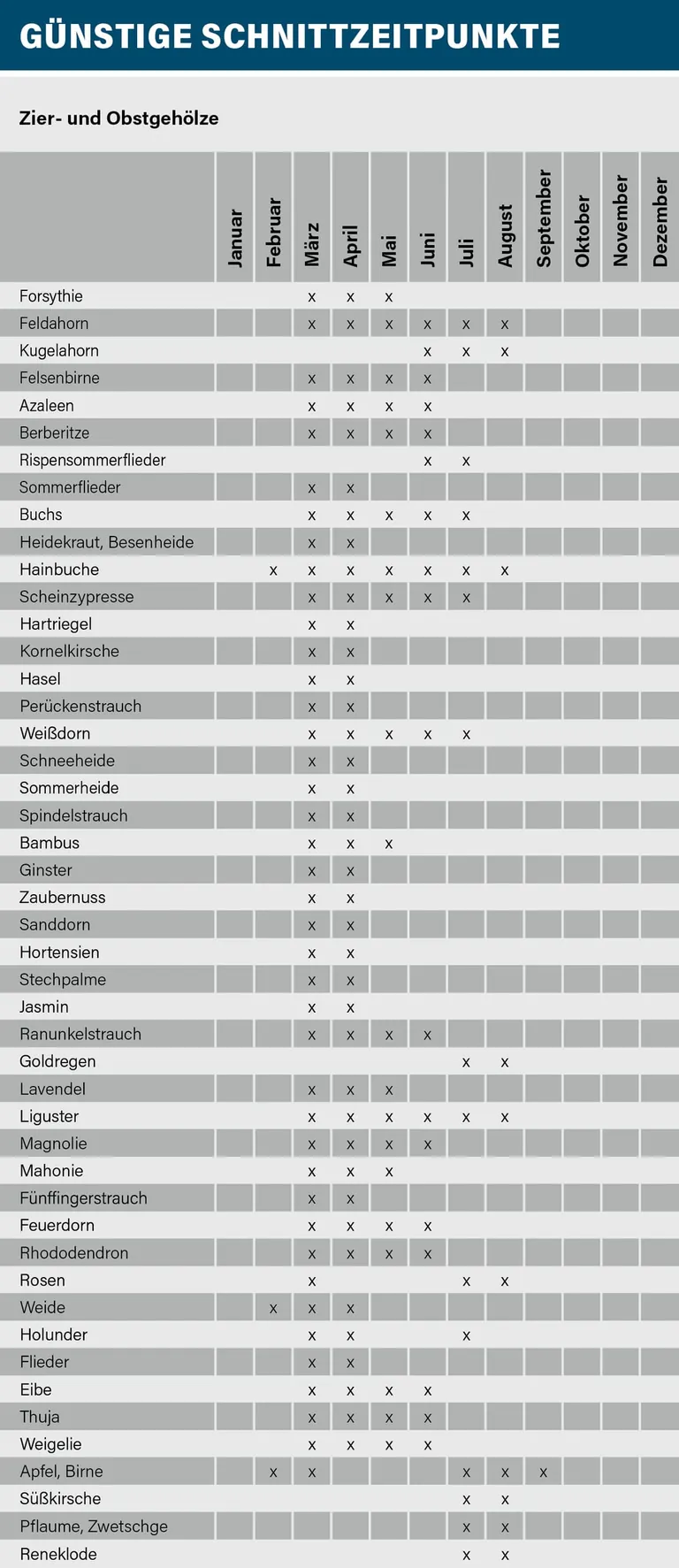 Grundsätzlich gilt: Je früher im Jahr man schneidet, desto stärker ist der Austrieb. Je später geschnitten wird, umso mehr Reservestoffe wurden bereits von der Wurzel in die Triebe verlagert. Der Saftdruck ist bei einem späteren Schnitt geringer und der Neuaustrieb fällt schwächer aus. Wenig vitale Gehölze sollten schon im Februar geschnitten werden. Sie treiben dann stärker aus. Bei frostempfindlichen Gehölzen wie Lavendel sollte der Rückschnitt bis April hinausgezögert werden. (Anmerkung der Redaktion: Eine Auflistung verschiedener Zier- und Obstgehölze mitsamt ihrer günstigen Schnittzeitpunkte finden Sie am Ende dieses Beitrags.)