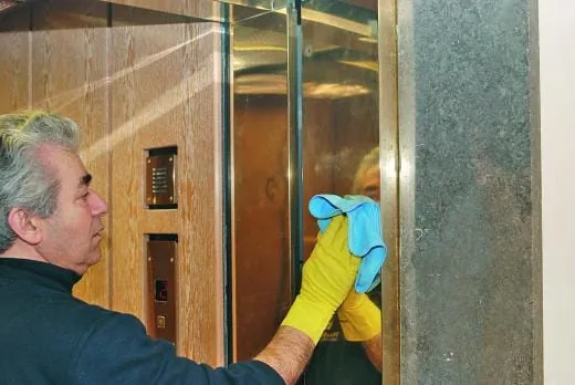 Messing findet sich im Römer darüber hinaus an und in den Aufzügen, auch die Schilder an den Büro- und Verwaltungsräumen sind aus dieser edlen Legierung. Neben der täglichen Unterhaltsreinigung werden alle Messingflächen einmal pro Woche intensiv mit einem Edelstahlreiniger und -pflegeprodukt bearbeitet. „Fettablagerungen oder hässliche Griffspuren dürfen hier keinesfalls entstehen, alle Messingteile müssen perfekt sauber sein und glänzen“, erklärt Dimitrios Domohtsidis, Bereichsleiter Hochhaus Gebäudedienste.