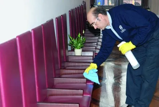 Aufgaben, die wie die Messingreinigung reine Handarbeit erforderlich machen, gibt es im Römer reichlich. So werden die Lampen und Lampenschirme im Objekt regelmäßig abgenommen, mit einem Spiritusreiniger gereinigt und wieder angebracht. Oder im Plenarsaal: Hier müssen alle Oberflächen oberhalb des Fußbodens nach jeder Sitzung gereinigt werden. Dazu kommt ein Multifunktionsreiniger (Multitan) zum Einsatz. Die Wirkung des Reinigers, der keine Tenside, Alkalien, Säuren oder Enzyme enthält, steigern die Mitarbeiter des Gebäudedienstleisters noch durch den Einsatz von Mikrofasertüchern. Auch im historischen Kaisersaal werden alle Einrichtungsgegenstände und Sitzgelegenheiten in der Unterhaltsreinigung mit diesem Multifunktionsreiniger gereinigt. „Dieses Produkt kann sehr universell eingesetzt werden. Das ist in diesem Objekt ein großer Vorteil. Und es genügen bereits sehr niedrige Anwendungskonzentrationen, um gute Ergebnisse zu erzielen“, macht Dimitrios Domohtsidis deutlich. „Zudem bildet der Reiniger keine Rückstände, was für uns absolut wichtig ist.“