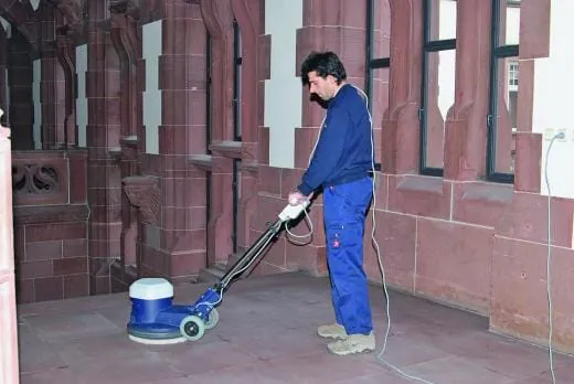 In stark frequentierten Objekten wie dem Frankfurter Römer ist der Schmutzeintrag entsprechend hoch. Schon aus diesem Grunde ist die Oberflächenbeschaffenheit der hier verlegten Natursteinbeläge von entscheidender Bedeutung für die Optik und auch für eine möglichst einfache und rationelle Unterhaltsreinigung. Eine zu große Aufnahme von eingetragenem Schmutz ist unbedingt zu vermeiden. Dimitrios Domohtsidis: „Eine der wesentlichen Aufgaben im Römer ist die Sicherung des einwandfreien Zustandes der Natursteinböden. Um den einwandfreien Gesamteindruck im Objekt beizubehalten, ist es notwendig, die Fußbodenflächen in regelmäßigen Zeitabständen zu polieren. Das gilt für die Parkettböden, ganz besonders aber für die Steinböden.“