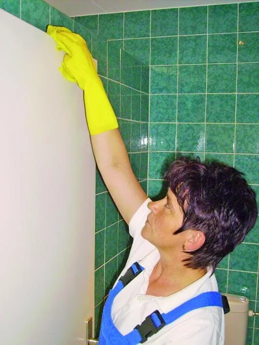 Bis zum frühen Vormittag sind sämtliche Sanitäranlagen im Haus von der Decke bis zum Boden blitzblank. Iris Scurt: „Sämtliche Keramikobjekte, Spiegel, Armaturen, Wandfliesen und Fußböden werden täglich desinfizierend gereinigt.“ Ebenso sorgfältig müssen die Schamwände und Türen samt Oberkanten sowie die Hygienebehälter gereinigt werden. Anschließend füllen die Mitarbeiter die Spender für Toilettenpapier, Stoffhandtücher und Seife auf. Es hat sich bewährt, dass jeder Mitarbeiter auf jedem Gebiet firm ist. Bernd Deich: „Durch das Rotationsprinzip vermeiden wir Monotonie. Außerdem können wir auf diese Weise flexibler reagieren.“