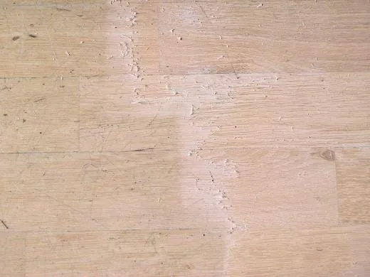 04 Das Parkett war über lange Zeit mit einer ungeeigneten Dispersionspflege gewischt worden. Die Beschichtung löste sich daher schuppen artig und zäh.
