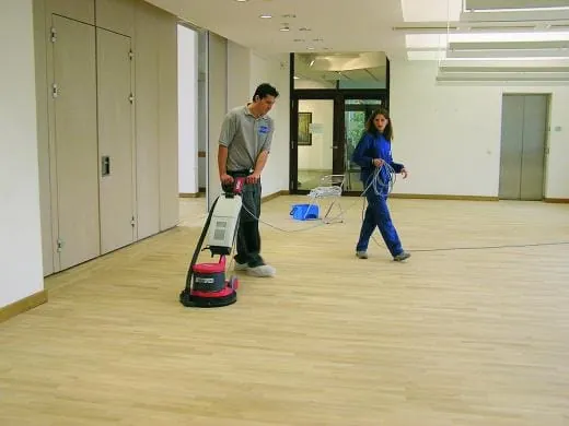 -Was früher Telefonate und Bittschreiben erforderte, erledigt heute die Mundpropaganda. „Meister Dornbrach“ muss nicht mehr lange suchen, um passende Objekte für seine Auszubildenden der überbetrieblichen Lehrwerkstatt (ÜBL) zu finden. „Die Leute rufen an und fragen ,könnt Ihr nicht dies oder das bei uns reinigen‘, aber ich nehme nur Aufträge an, die für die Ausbildung interessant sind.“ Das war beim Projekt Museum Baden in Solingen der Fall. Hier brachte ihn ein ortsansässiger Geschäftsführer eines Innungsbetriebs auf die Spur, dem das unansehnliche Parkett aufgefallen war. Er kontaktierte Bernd Dornbrach, Gebäudereinigermeister und Lehrer für Reinigungstechnik der Gebäudereiniger-Innung Essen/Mühlheim/Oberhausen. „Der Boden sah sehr abgenutzt aus“, erinnert er sich, „Alkohlflecken, Essensreste, Stöckelschuhspuren und so weiter. Der Belag war zuletzt vor 20 Jahren abgeschliffen worden.“ Der Leiter der ÜBLrückte mit einer Gruppe Auszubildenden des 3. Lehrjahres an. Sieben Arbeitstage waren sechs bis acht Auszubildende damit beschäftigt, den Boden abzuschleifen, zu versiegeln und zu polieren. Rund 250 m2 Parkett waren zu bearbeiten. Ausbildungsziel war der richtige Umgang mit Band-, Rand-, Schwing- und Deltaschleifer, sowie das fachgerechte Versiegeln und Polieren.