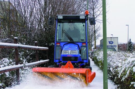 Wege schnell von Schnee zu befreien ist oft leichter gesagt als getan. Parkende Autos, Sträucher oder ungünstig platzierte Laternen behindern die freie Fahrt. Dann ist ein möglichst kompakter und schmaler Schneeräumtraktor von Vorteil, mit dem solche Engpässe leichter durchfahren werden können. Iseki bietet Komplettlösungen ab Werk. Der Traktor ist mit einem passenden Schneeschild und einem Splitt- und Salzstreuer ausgestattet. Das Fahrzeug verfügt über einen Dieselmotor und Allradantrieb. In der 25-PS-Klasse ist es 1.070 mm breit, in der 35-PS-Klasse 1.120 mm.