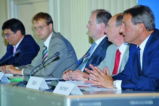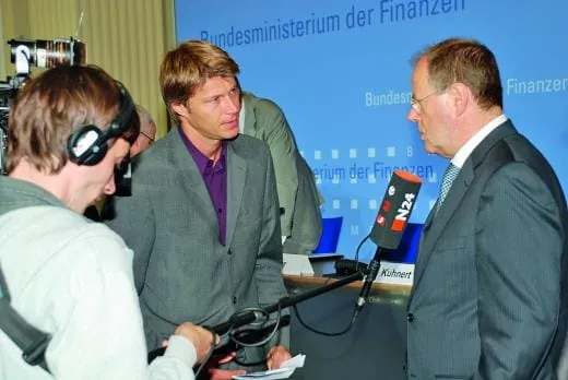 -Großer Auflauf im Bundesfinanzministerium: Zahlreiche Fernsehteams, Fotografen und Journalisten drängten sich vor dem Podium, auf dem Bundesfinanzminister Peer Steinbrück, Bundesinnungmeister Dieter Kuhnert und Frank Wynands (Vorstandsmitglied IG Bauen-Agrar-Umwelt) Platz genommen haben. Komplettiert wurde die Runde durch Oliver Heyder-Rentsch (Sprecher für Steuerpolitik im Bundesfinanzministerium) und Ministerialdirektor Hans-Joachim Stähr (Leiter der Zoll- und Verbrauchsteuerabteilung im Bundesministerium und auch zuständig für die Finanzkontrolle Schwarzarbeit).