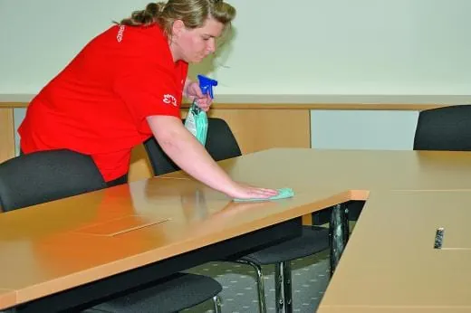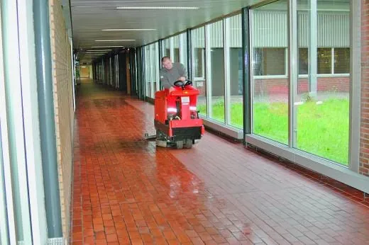 Die Flure und die Zubringerbereiche im Verwaltungstrakt sind durchgängig mit Klinkerbelägen ausgestattet. Hier wird dreimal wöchentlich die gesamte Fläche (immerhin gut 15.000 m2) mit dem Automaten abgefahren, um den auch im Verwaltungsbereich auftretenden Feinstaub zuverlässig zu entfernen. Gereinigt wird auch hier mit dem Automatenreiniger, der in der Produktion zum Einsatz kommt. Nicht ohne Grund, denn die enthaltene rückfettende Pflegekomponente schützt den Belag vor Auslaugeffekten, die gerade auf einem Klinkerbelag bei unsachgemäßer Materialwahl zu unschöner Optik führen können. „Und der Pflegefilm ist nicht nur schmutzabweisend und trittsicher, er erleichtert die nachfolgenden Unterhaltsreinigungen und wirkt zudem noch antistatisch“, ergänzt Andreas Luther. Der Maßgabe, möglichst wenig verschiedene Reinigungsmittel im Objekt vorhalten zu müssen, kommt entgegen, dass der Automatenreiniger auch im manuellen Wischverfahren eingesetzt werden kann. Und Stellen, an denen Automaten nicht bis in die letzte Ecke reinigen können und Handarbeit gefragt ist, gibt es zur Genüge – nicht nur in diesem Objekt. Viel Handarbeit ist auch bei der Unterhaltsreinigung in den Büros angesagt. „Für die Unterhaltsreinigung setzen wir hier einen Kunststoffreiniger ein. Damit können wir das gesamte Inventar in den Büros und den Sitzungszimmern reinigen. Angenehmer Geruch und umweltfreundliche Rezeptur sind neben der wirtschaftlichen Nutzung durch eine Sprühpistole weitere Vorteile, die unsere Entscheidung für dieses Produkt begründen“, macht Andreas Luther deutlich. Haftende Verschmutzungen wie mineralische, tierische oder pflanzliche Fette, Fingerabdrücke, aber auch Kugelschreiber- Filzstift, Stempelfarben und Permanentstift-Verstrichungen lassen sich mit diesem Reiniger (Sprinter Power) vollständig entfernen, ohne dass die Oberflächen angegriffen werden.