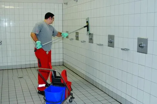 Die im Sanitärbereich verlegten Steinzeugfliesen am Boden und auch alle gesamten senkrechten Fliesenflächen werden täglich im Wischverfahren gereinigt. „Der eingesetzte Hochleistungs-Sanitärreiniger ist für alle säurefesten Oberflächen in diesem Bereich geeignet, daher ist effektives Arbeiten möglich“, erklärt Manfred Zentgraf, Produktmanagement Tana. Und weiter: „Er löst Kalk- und Urinstein, Rost, Zementschleier und Kalkseifenablagerungen und die dickflüssige Konsistenz begünstigt eine schnelle, vollständige Schmutzentfernung auch auf senkrechten Flächen.“ Die Mitarbeiter der GRG setzen den Reiniger (Tasonil Ultra Fresh) in zweiprozentiger Anwendungskonzentration ein, dann wird mit klarem Wasser nachgespült. Der saure Reiniger und das mechanische Reinigungsverfahren verhindern, dass sich mineralische Rückstände aufbauen. Die Oberfläche im Sanitärbereich weist ein einwandfreies Erscheinungsbild auf. Andreas Luther ist sehr zufrieden, denn „die Sicherheitsfliesen in den Duschen sind sehr schwer sauber zu halten. Wegen der hohen täglichen Frequenz ist das hier ein echter Problembereich, den wir aber gut im Griff haben.“
