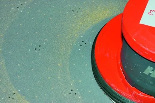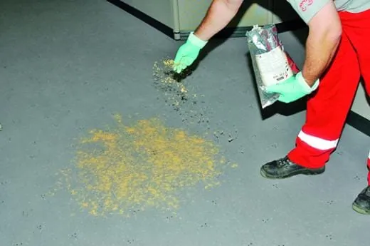 Wie der Zufall es will, werden während des Reportagetermins bei Prinovis die Mitarbeiter der GRG gerufen, um eine Verschmutzung durch Druckfarbe auf einem Teppichboden im Verwaltungsbereich zu entfernen. Auf dem Weg dorthin erzählt Andreas Luther, dass „die Textilbeläge täglich in der Unterhaltsreinigung mit einem Klopfsauger gereinigt werden. Verfleckungen durch Produktionsschmutz im Verwaltungsbereich werden meist erst nach Arbeitsschluss entfernt, auch wenn diese Maßnahmen schnell durchzuführen sind und eigentlich die Arbeitsabläufe in den Büros nicht stören.“ Beim verschmutzten Belag handelt es sich um einen hellen Kurzvelours. „Weil es zu den Büros Personalzugänge aus der Produktion gibt, sind hier immer wieder Detachurmaßnahmen fällig“, erzählt Fernando Rosso (Objektleiter GRG). „Wir verwenden für diese Arbeiten – je nach Flächigkeit der Verschmutzung – ein Teppichreinigungspulver, wenn notwendig auch noch einen universellen Fleckenentferner, schildert der Objektleiter die Arbeitsweise, die verschiedene Vorteile hat: Mit dem Trockenreinigungspulver bzw. der Kombination Teppichpulver/Fleckenentferner wird die schnelle Anlösung der Verschmutzung und die Absorption direkt am Pulver erreicht. Nach dem Absaugen bleiben keine klebrigen Rückstände auf dem Teppich und die Fläche ist sofort wieder begehbar. Kurz nach Prüfung der verschmutzten Stellen schreiten die Reinigungskräfte zur Detachur: Pulver aufstreuen, mit Einscheibenmaschine einmassieren und nach kurzer Einwirk- beziehungsweise Trockenzeit absaugen – fertig.