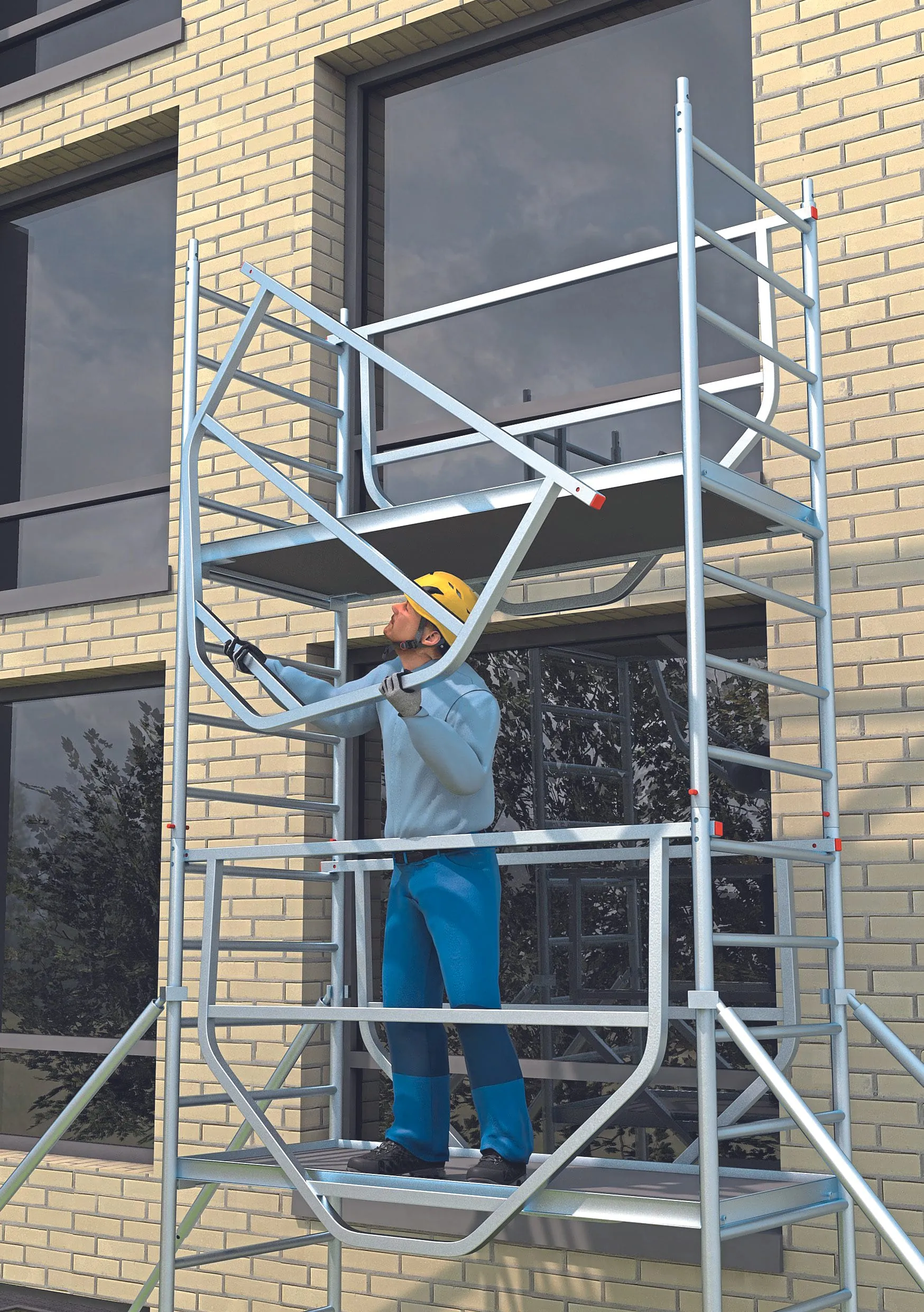 Besonders sicher sind Systeme mit einem vorlaufenden integrierten Seitenschutz, die die BG BAU fördert. Bei vorlaufendem integrierten Seitenschutz montiert oder demontiert die Person aufgrund der vorgegebenen Montagereihenfolge den Seitenschutz immer aus der darunterliegenden Ebene im gesicherten Bereich. Wie bei den Hubarbeitsbühnen können Werkzeuge und Materialien auf dafür vorgesehenen Flächen gelagert werden.