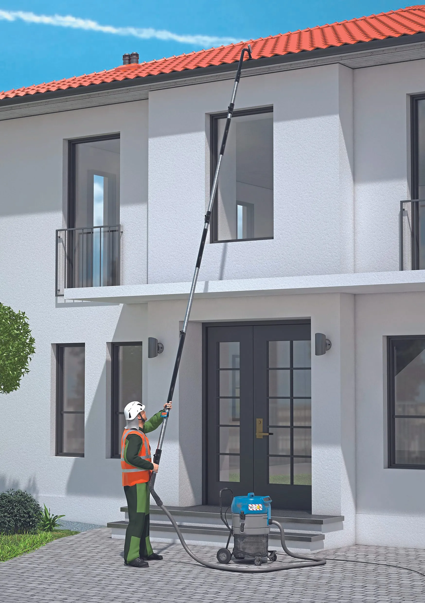 Mit Teleskopstangensystemen – im Gegensatz zu Arbeiten in der Höhe auf Leitern mit Absturzgefährdung – gibt es auch die Möglichkeit, diese sicher vom Boden aus auszuführen. Diese können beispielsweise für die Reinigung von Glas- und Fassadenflächen, Photovoltaikanlagen auf schrägen Dächern, von Rohrleitungen und Installationen in Hallen an Wänden oder Decken sowie an der Unterseite von Dachvorsprüngen genutzt werden. Für die Reinigung von Dachrinnen haben sich Rinnensauger mit Teleskopstangen oder Stecksystemen etabliert und können über Kamerasysteme oder Winkelspiegelbrillen sicher und effizient verwendet werden. Beide Systeme benötigen wenig Platz und können in normalen Fahrzeugen ladungsgesichert zum nächsten Einsatzort transportiert werden.