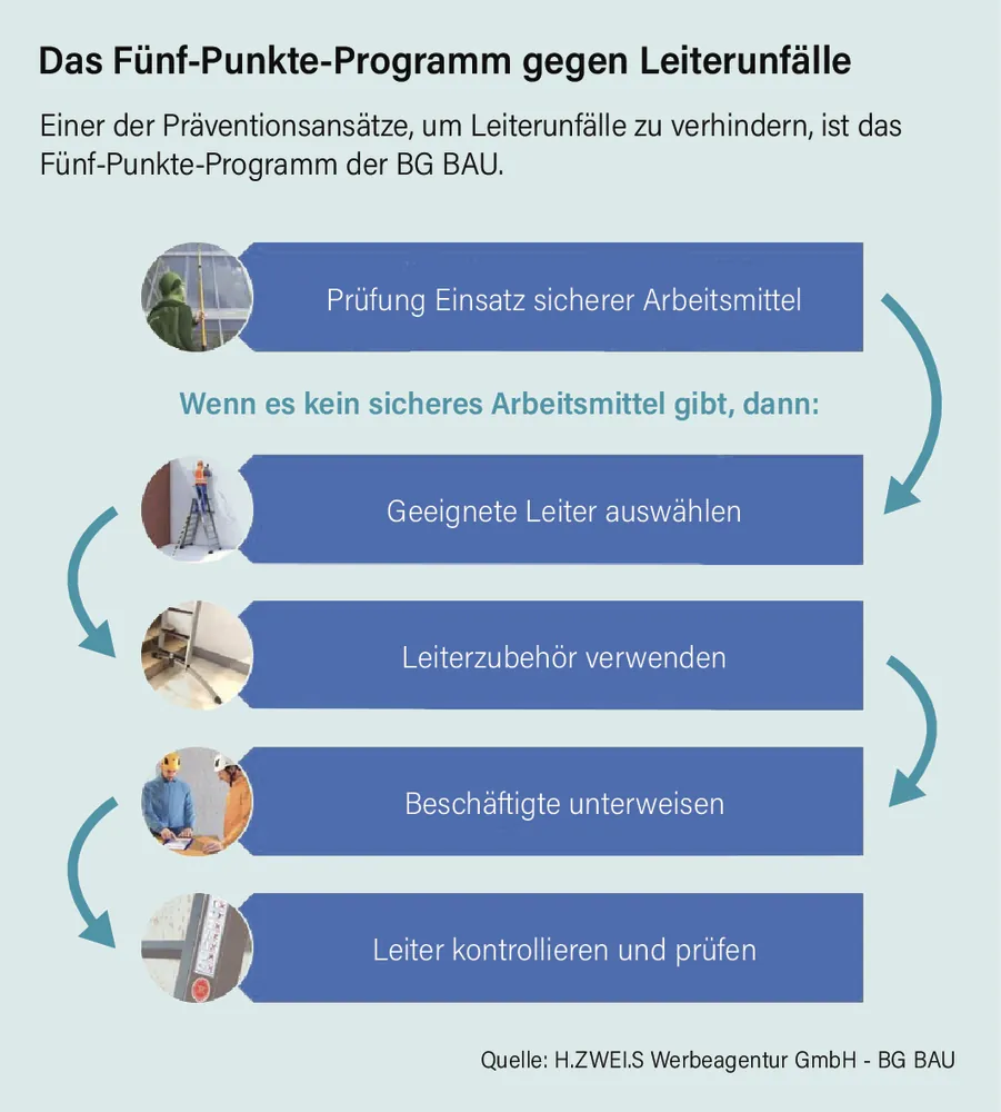 Seit vielen Generationen ist das Risiko beim Umgang mit Leitern also bekannt und doch gibt es keine Veränderung bei den Unfallzahlen. So verzeichnet die Unfallstatistik der Deutschen Gesetzlichen Unfallversicherung (DGUV) auch heute pro Jahr circa 10.000 Leiterunfälle sowie rund 1.000 Neurenten im Bereich der baulichen Anlagen. Miterfasst sind hier auch die Unfälle auf Baustellen oder in der Gebäudereinigung. Das müsste so nicht sein, denn es gibt für viele Tätigkeiten bessere und sicherere Arbeitsmittel zum Arbeiten in der Höhe als eine Leiter.