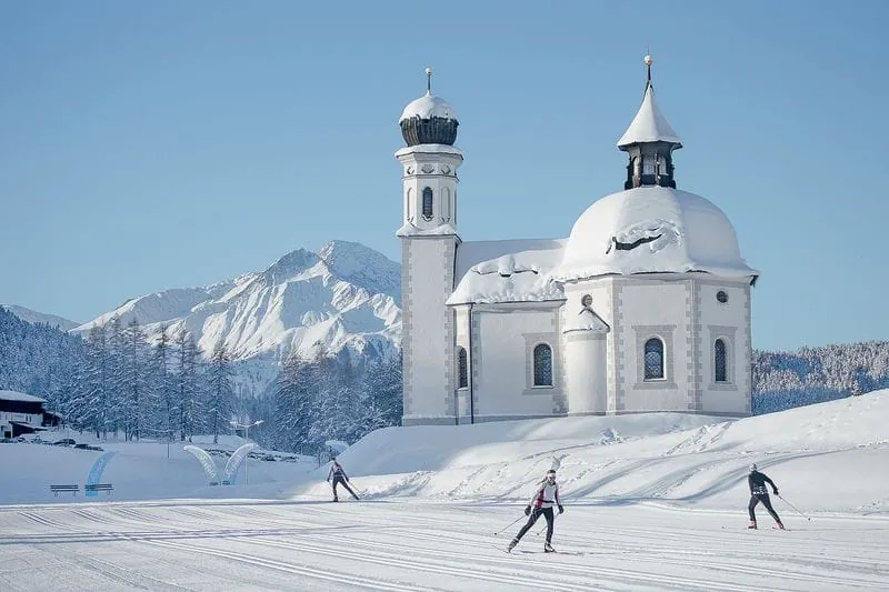 Nach solchen Höchstleistungen muss aber niemand streben, der im Langlaufparadies der Seefelder Hochebene auf die Bretter steigt. Vom idyllischen Seekirchl aus erschließt sich ein nordisches Skigebiet, das in Mitteleuropa seinesgleichen sucht. Mehr als 270 Kilometer Loipen für klassische wie Skatingtechnik bieten zwischen Leutasch, Seefeld und Raith alle Schwierigkeitsgrade. Zur Einstimmung geht es auf die mittelschwere Mösern-Runde. Die sechs Kilometer führen zunächst ganz flach an den Sprungschanzen vorbei, ehe es ein paar Anstiege und Abfahrten zu meistern gilt. Die Bedingungen sind perfekt. Aufgrund der Höhenlage auf 1.200 Metern gilt Seefeld als eines der schneesichersten Langlaufgebiete der Alpen, wie der Skitourismusforscher Günther Aigner den Tirolern bescheinigt hat. Und die Erfahrungen als Ausrichter der nordischen Ski-Weltmeisterschaften von 1985 sowie der nordischen Skidisziplinen bei den Olympischen Spielen von Innsbruck kommen auch den Freizeitsportlern zugute. Die Loipen sind bestens präpariert. Ein neu entwickeltes Rettungskonzept hat nach Angaben des Tourismusverbandes die Einsatzzeit bei Unfällen auf die Hälfte reduziert.