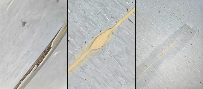 Hierzu wurden folgende Arbeiten durchgeführt. Die Bereiche, bei denen die Schweißnähte beschädigt waren und sich durch die eingedrungene Feuchtigkeit aufgestellt hatten, wurden plan geschliffen. In Teilbereichen kam es hierbei zu Ausbrüchen, die mit einer PU-Ausgleichsmasse verfüllt wurden. Nach dem Abtrocknen wurde die Schadstelle durch PU-Siegel vor eindringender Feuchtigkeit geschützt..