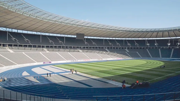 Für die charakteristisch blaue Tartanbahn im Berliner Olympiastadion wurde mithilfe eines neuen Produktes die passende Reinigungslösung gefunden. - © Arva Greentech