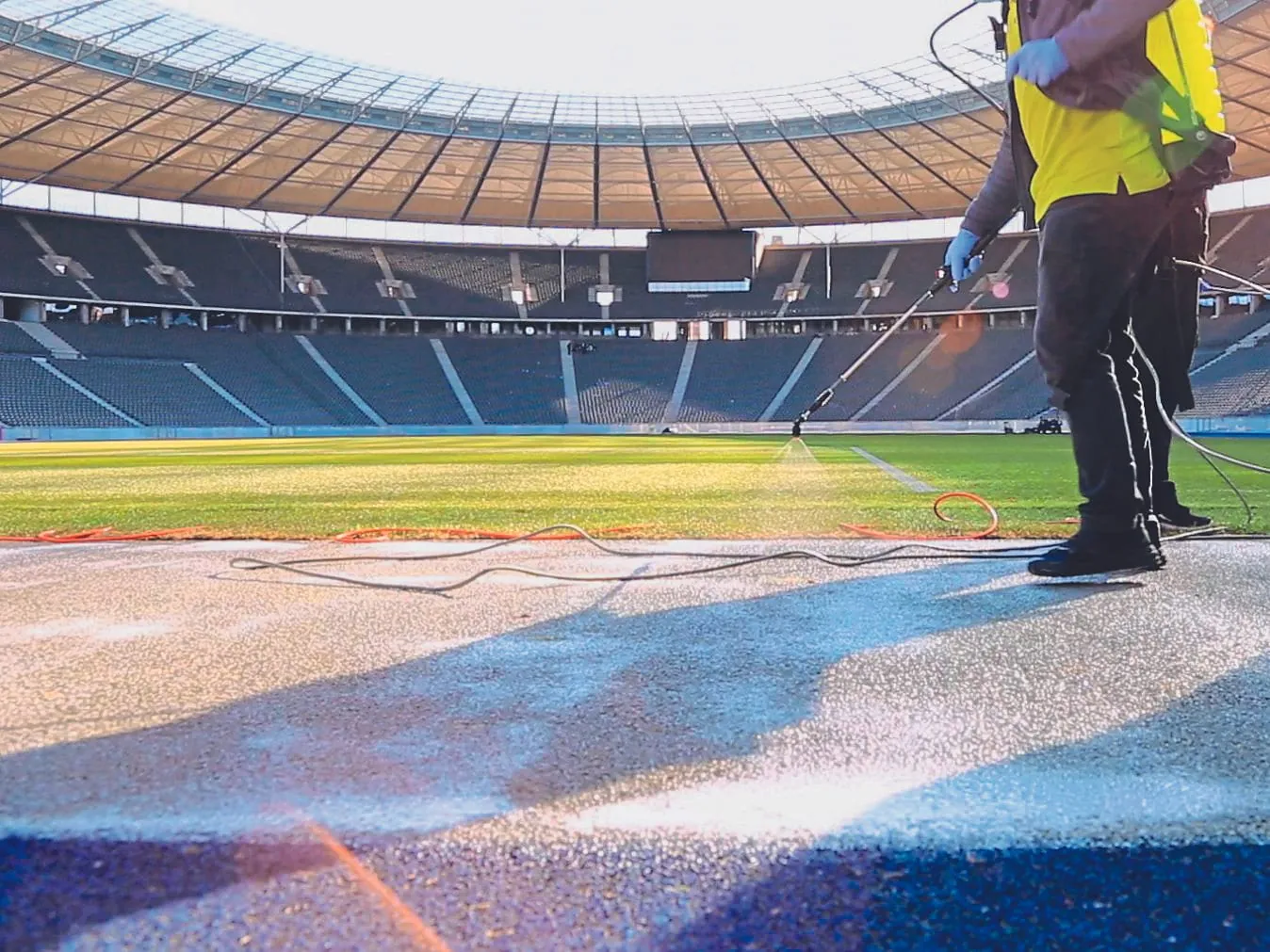 Bisher wurde die Laufbahn des Olympiastadions in Berlin mit Walzenbürsten, Hochdrucksprühern und Wasser gereinigt. Dabei wurde jedoch nicht das gewünschte Ergebnis erzielt, denn die Verschmutzungen ließen sich nur oberflächlich aus dem tiefporigen Kunststoffbelag entfernen. Daher wurde ein speziell für Kunststoffoberflächen entwickeltes Produkt neu eingesetzt – mit einem sehr guten Reinigungsergebnis.