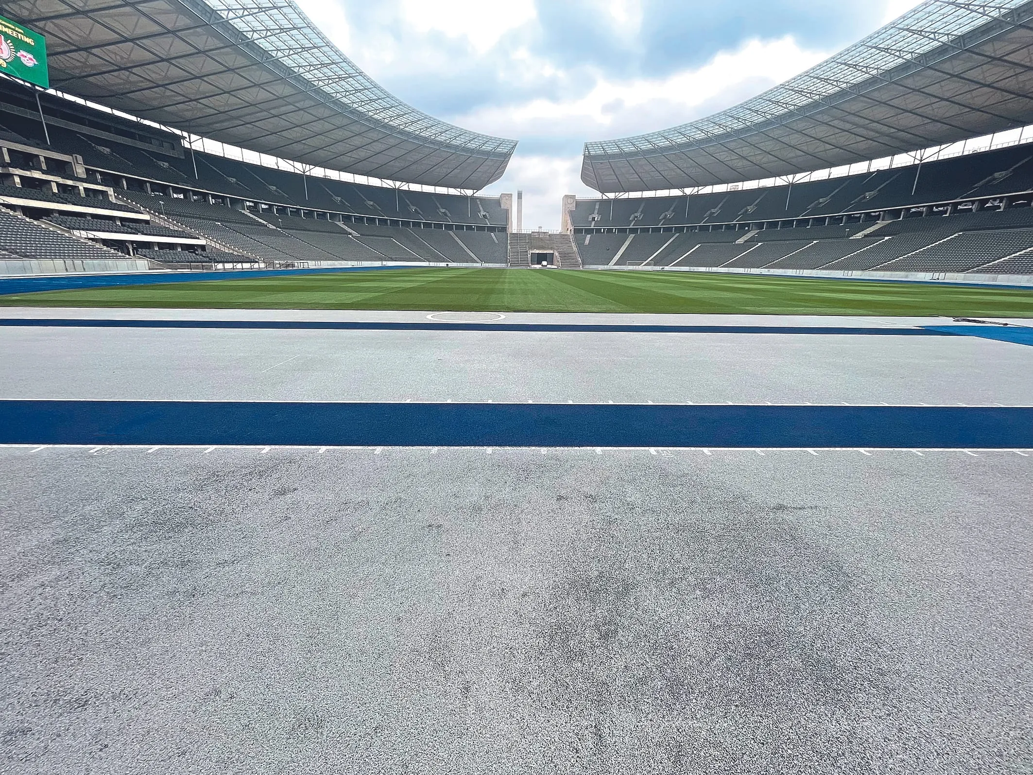 Für die charakteristisch blaue Tartanbahn im Berliner Olympiastadion wurde mithilfe eines neuen Produktes die passende Reinigungslösung gefunden.