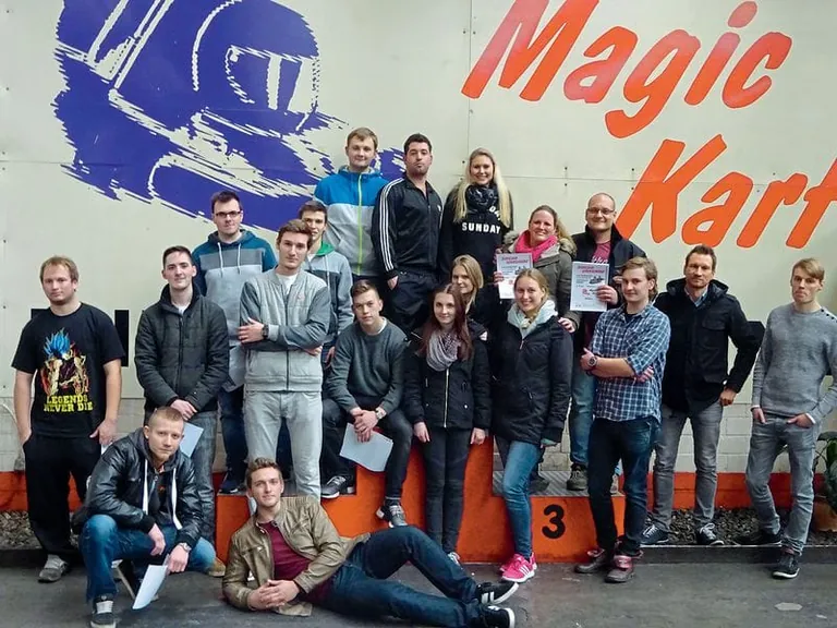 Unter der Führung von drei Abteilungsleitern trafen sich 16 alte und neue Auszubildende zum Teamevent auf der Magic-Kart-Bahn in Hilden. Dort konnten die Azubis ihre Geschicklichkeit beim Kartfahren und beim Lasergame erproben. Die drei Schnellsten auf der Kart-Bahn wurden anschließend bei einer kleinen Siegesfeier mit einer Urkunde ausgezeichnet. Beim Lasergame konnten alle ihr Talent in Bezug auf Beweglichkeit und Koordination beweisen. In einem Labyrinth galt es, mit kluger Taktik, Treffsicherheit und schneller Reaktion den Spielgegner mit der Laserpistole zu treffen oder ihm geschickt auszuweichen. Am Ende gab es vom Veranstalter für jeden Mitspieler eine Auswertung über die Schuss- und Trefferanzahl.