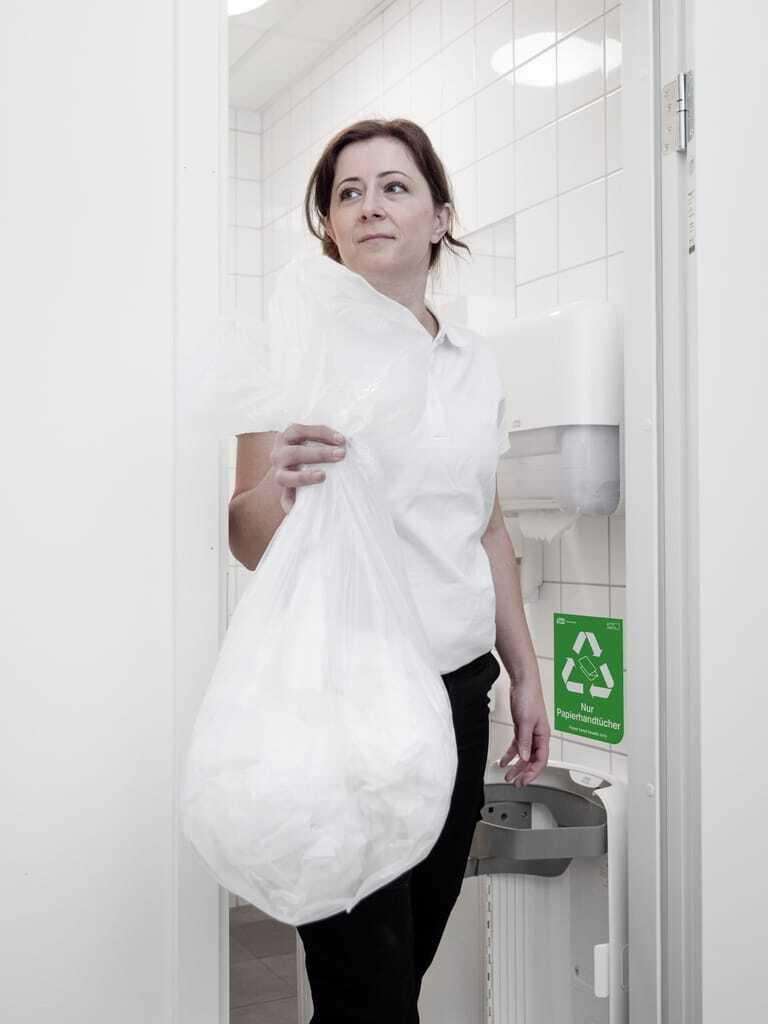 In den 30 WC- und Waschraumcontainern der BUGA 23 werden die Besucher auf Tork PaperCircle und das Trennen des Papierhandtücher-Abfalls aufmerksam. Die gebrauchten Tücher werden abgeholt und recycelt. - © Tork