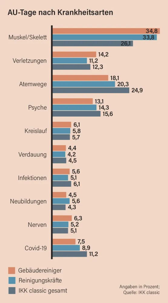 Die IKK Classic erstellt jährlich für die im Handwerk beschäftigten Versicherten eine eigene Fehlzeitenstatistik, die auch Durchschnittswerte für die einzelnen Branchen enthält. Im Reinigungsgewerbe liegt der Wert bei 8,1 Prozent (Gebäudereiniger) beziehungsweise 7,7 Prozent (Reinigungskräfte). Im Handwerk insgesamt sind es 6,9 Prozent. Kerstin Meier, handwerk magazin