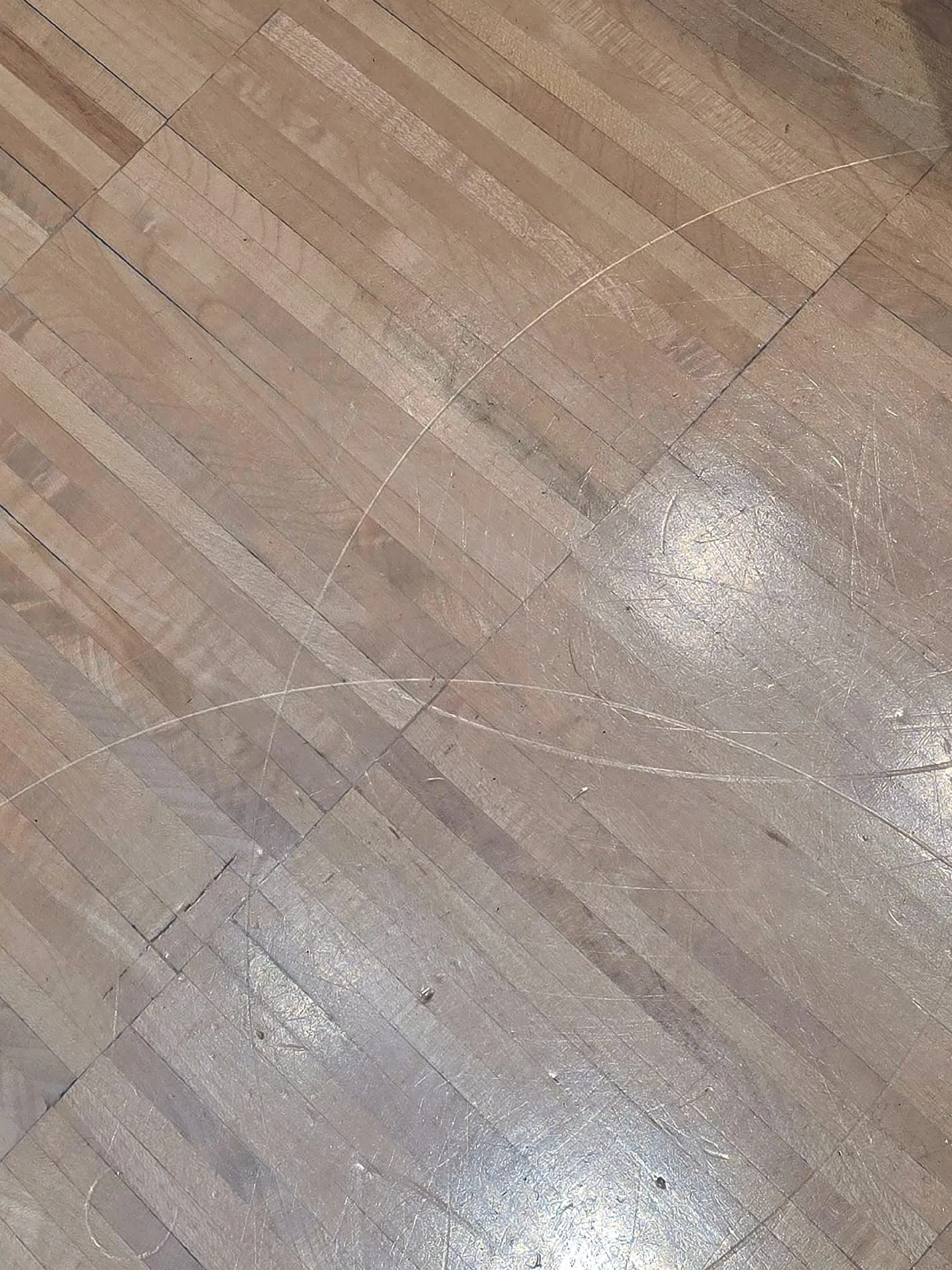 - Gleichzeitig war die Oberfläche aufgrund der seit Jahren überfälligen Schleif- und Neuversiegelungsmaßnahme, der außergewöhnlichen Nutzungsintensität und des fehlenden Pflegekonzepts bereits so vorgeschädigt, dass jede zusätzliche mechanische Belastung mit hoher Wahrscheinlichkeit zu sichtbaren Schäden führen musste.