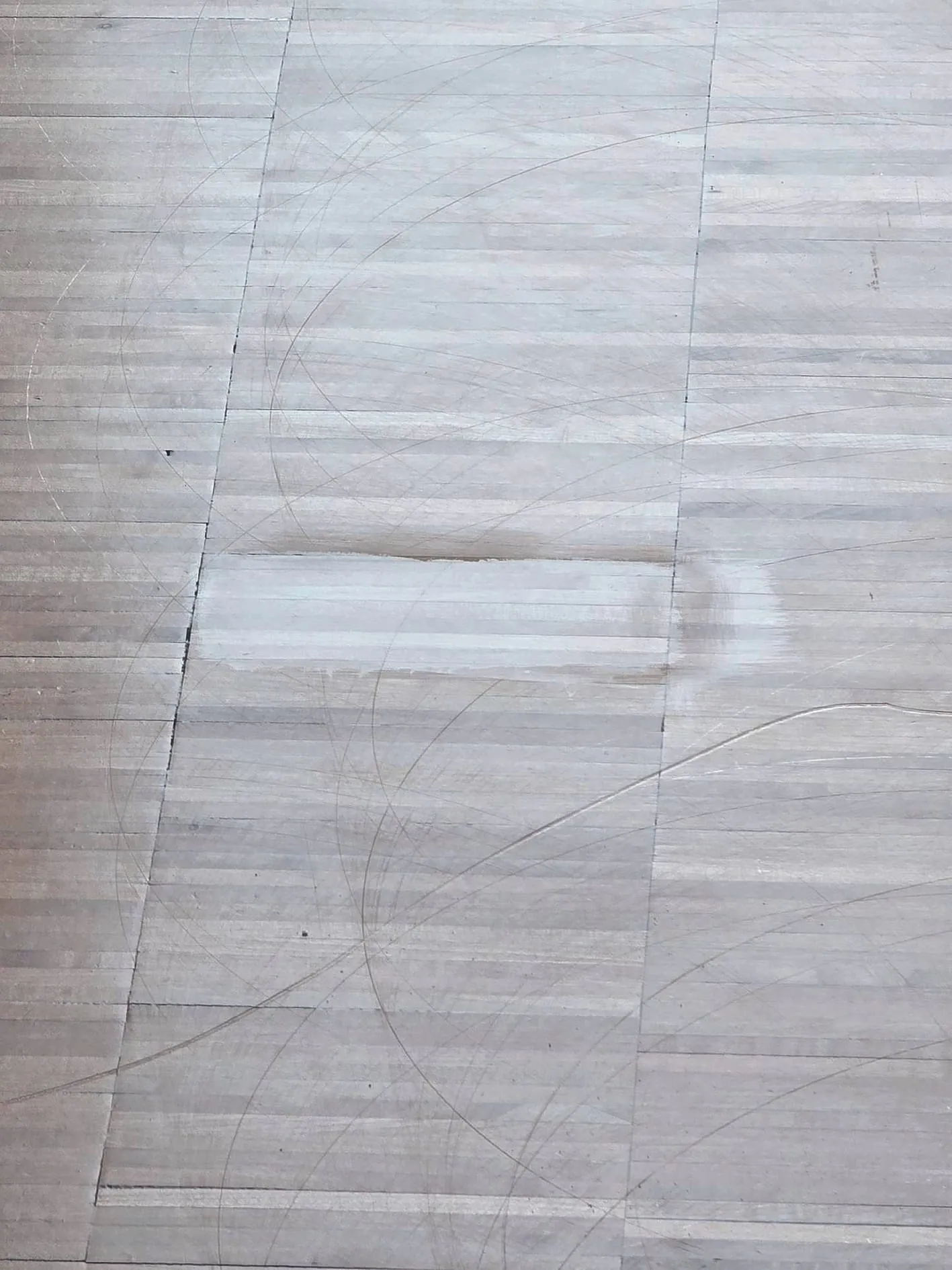 - Großflächige, bogenförmige Spuren mit charakteristischer Überlagerung. Eindeutig den Arbeitsbahnen einer Einscheibenmaschine/eines Reinigungsautomaten mit Treibteller zuzuordnen.