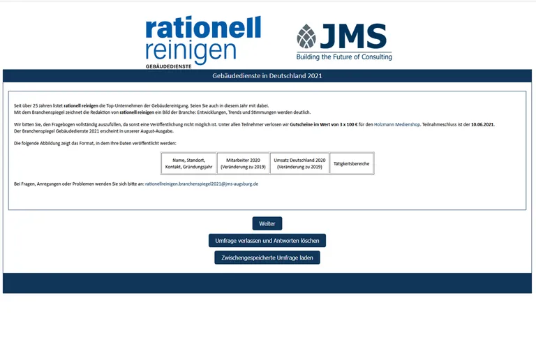 Die rationell-reinigen-Umfrage Gebäudedienste in Deutschland 2021 geht in die Endphase: Gebäudedienstleister können sich noch bis einschließlich Donnerstag, 10. Juni, beteiligen.