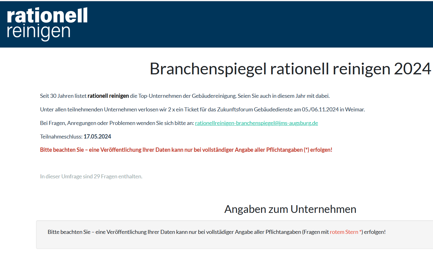 Kosten entstehen den Unternehmen durch die Teilnahme nicht. Voraussetzung für die Listung im Branchenspiegel Gebäudedienste in Deutschland 2024 ist lediglich, dass alle erforderlichen Angaben gemacht werden – und zwar bis Freitag, 17. Mai 2024. Spätere Einsendungen und nicht vollständig ausgefüllte Fragebögen können nicht berücksichtigt werden.