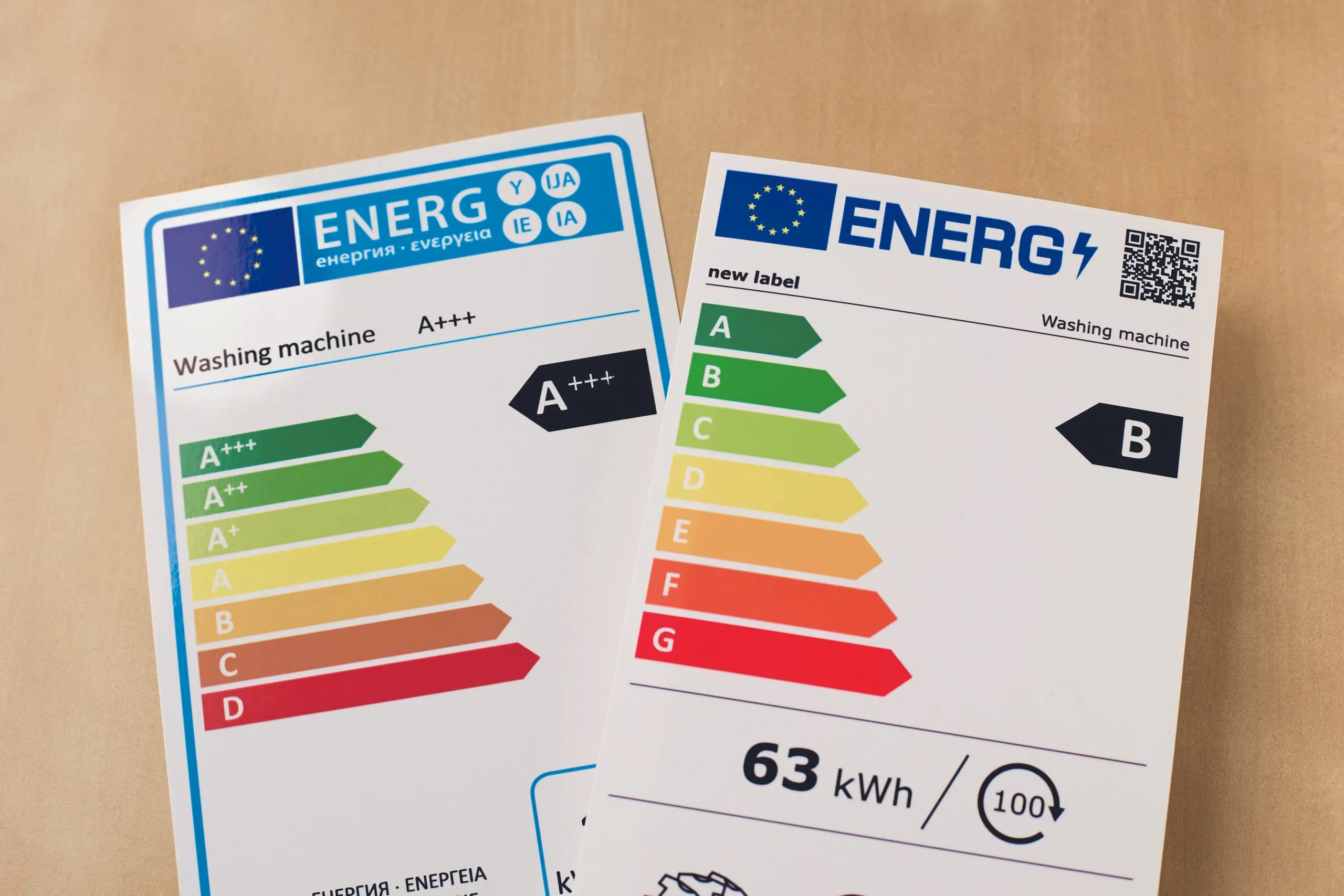 Werden neue Waschmaschinen und Trockner angeschafft, sollte auf die Energieeffizienzklasse geachtet werden. Besonders effiziente Maschinen haben einen deutlich geringeren Stromverbrauch bei gleicher Reinigungs- und Trocknungsleistung. Auf der Skala von A bis G sind mit A gekennzeichnete Maschinen die sparsamsten.