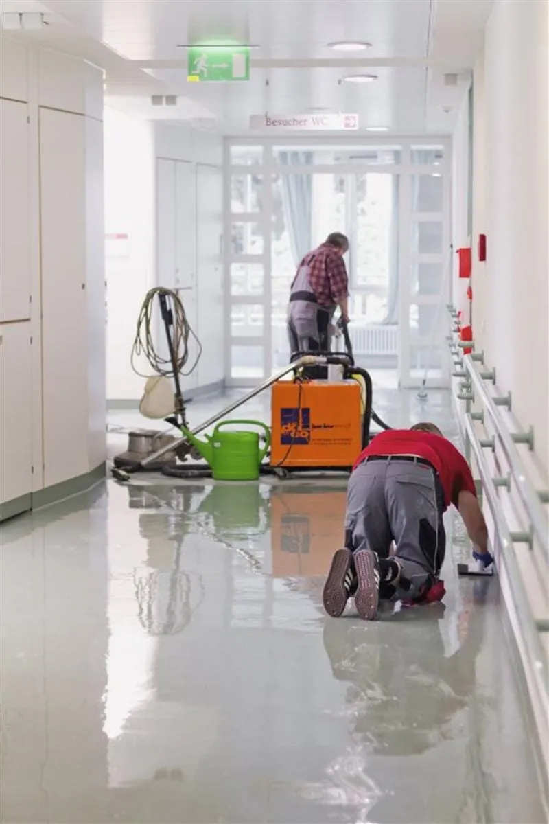 - Die Anforderungen an Bodenbeläge in Krankenhäusern und klinischen Einrichtungen sind vielfältig. Neben strengen Hygienevorschriften spielen Robustheit, Reinigungsfreundlichkeit und Unempfindlichkeit gegenüber Desinfektionsmitteln eine große Rolle. Weil bei Renovierungsmaßnahmen im Gesundheitswesen besonders wirtschaftliche Aspekte und Zeitdruck berücksichtigt werden müssen, entschied man sich im Stuttgarter Marienhospital für eine Effektiv-Grundreinigung und Versiegelung der ansonsten intakten Beläge in der zweiten Etage des Gebäudes St. Paul. Dort sind unter anderem chirurgische Abteilungen untergebracht.