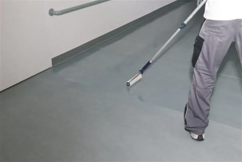 Der lösemittelfreie Zwei-Komponenten-Lack wurde zweimal mit Rollenwalzen aufgetragen, was nicht nur für ein gleichmäßiges Erscheinungsbild des elastischen Belags sorgt, sondern auch für eine lange Haltbarkeit des strapazierfähigen elastischen Schutzfilms. Die Permanentversiegelung macht den Boden haltbarer als eine herkömmliche Beschichtung und ist chemikalienbeständig nach DIN 68861 18 und schweiß- und speichelecht nach DIN 51180.