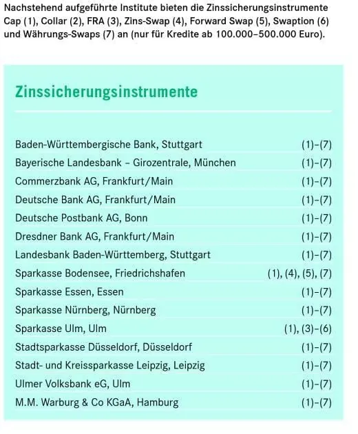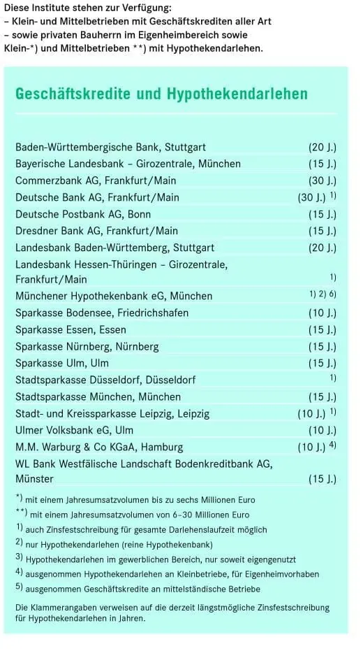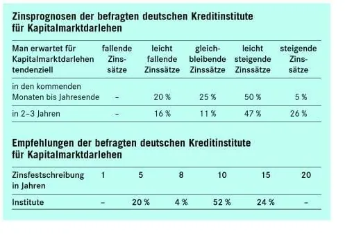 Das US-Fiasko beweist den Wert einer verantwortungsbewussten Kundenbetreuung, die auch die Ablehnung eines Kundenkreditwunsches einschließen muss, kann der Kunde kein angemessenes Eigenkapital zum Immobilienkauf einsetzen. Bekanntlich ist die Zinsprognose ein wichtiger Pfeiler einer guten Kundenbetreuung. So danken wir den Geldinstituten, die durch Teilnahme an unserer Umfrage nicht nur Interesse an Klein- und Mittelbetrieben signalisierten, sondern auch offensichtlich um verantwortungsbewusste Kundenbetreuung bemüht sind. Wir bedauern, dass sich die Bayerische Hypo- und Vereinsbank stillschweigend aus dem Kreis unserer Umfrageteilnehmer ausgeklinkt hat – ob wegen des Risikos einer Fehlprognose oder weil man der Kundenbetreuung nicht mehr ihren alten Stellenwert zugesteht: Wir wissen es nicht. Verabschiedet aus dem Umfragekreis hat sich die Landesbank Hessen-Thüringen, die nun primär Großunternehmen betreut.
