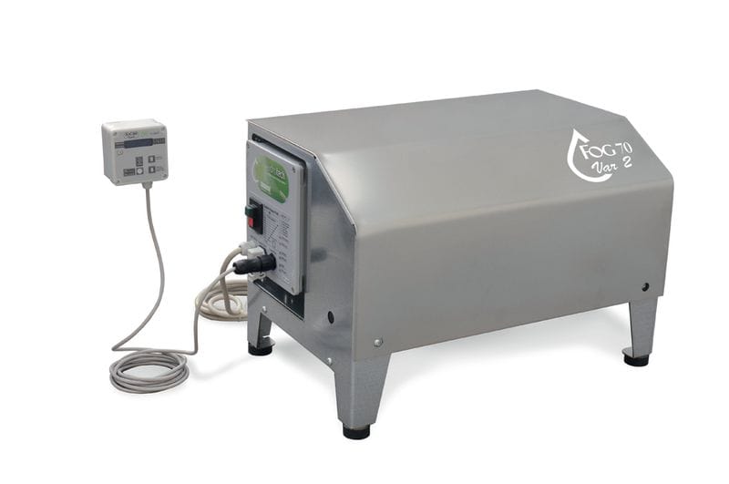 Mit einem neuen Verneblungssystem Fog 70 Var 2 bietet das italienische Unternehmen Idrobase die Möglichkeit, ausgehend von einer zentralen Pumpenstation mehrere Räume gleichzeitig mit Sprühnebel zu versorgen. Fog 70 Var 2 steuert die Versorgung der angeschlossenen Verneblungsanlagen mit Wasser und Strom. Um den Kosteneinsatz möglichst gering zu halten, lässt sich der Wasser- und Energieverbrauch an die Anzahl der jeweils aktiven Anlagen anpassen.