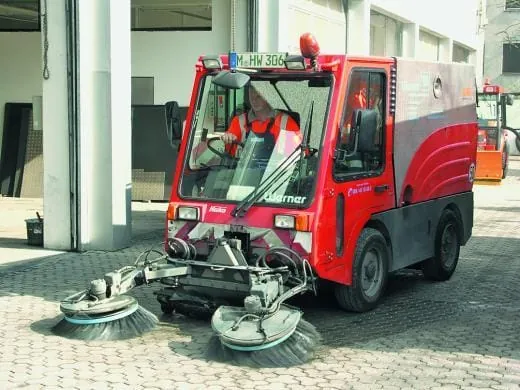 „Unsere Kehrmaschinen sind meistens auf festen Touren an bis zu sechs Tagen in der Woche zwischen acht und zwölf Stunden im Zweischichtbetrieb im Einsatz“, macht Betriebsleiter Dipl.-Wirtschaftsing. (FH) Stefan Dengler klar. Sie kehren Splitt im Winter, Blütenstaub im Frühjahr und Laub im Herbst. Hinzu kommen die üblichen Großstadtverschmutzungen. Die Kehrmaschinen müssen einfach zu bedienen sein und mit möglichst wenig Elektrik und Elektronik auskommen, damit sich der Fahrer im Notfall selbst helfen kann. „Die Kehrmaschinen werden im Alltag gefordert“, sagt dazu Stefan Dengler. „Dreck, Staub und Schmutz, Vibrationen, permanentes Fahren über Randsteine – in diesem Umfeld ist Elektronik schon sehr anfällig.“ Aber die Zusammenarbeit zwischen den beiden Unternehmen Hako und Werner geht noch weiter. „Gemeinsam haben wir eine Systemlösung für die Parkhaus- und Tiefgaragenreinigung entwickelt, die ihresgleichen sucht“, so der Betriebsleiter. Für die Kehrmaschinen wurde ein Hochdruckaggregat produziert, das schnell gewechselt werden kann. Es beseitigt mit einem Druck von 200 bar schnell und problemlos Ölfilme. Der Boden präsentiert sich danach wieder in einer ansprechenden Optik. „Hier erzielen wir so gute Ergebnisse, dass wir immer mehr Neukunden bekommen“, erzählt Stefan Dengler. „Die guten Ergebnisse sprechen sich in der Stadt herum.“