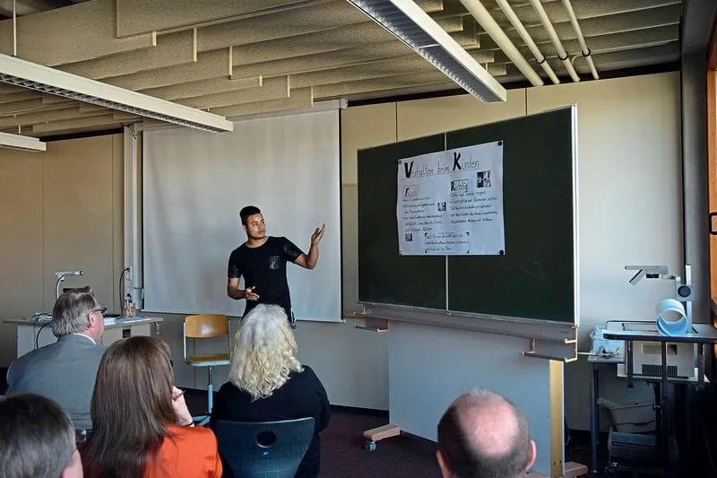 Auf dem Programm standen verschiedene Vorträge von Lehrern und Schülern. Dabei erhielten die Gäste nicht nur einen Einblick in die schulischen Aktivitäten des vergangenen Jahres und das Beratungsangebot an der Gewerblichen Schule. Deutlich wurde auch, dass Projektarbeit in Metzingen eine große Rolle spielt. Dazu gehört die Präsentation der Ergebnisse - vor den Mitschülern ebenso wie beim Ausbildertag: Die Schülerinnen Luisa und Sofia (Klasse B1GR2) stellten Nasswischsysteme vor, ihr Mitschüler Deivid (Klasse B1GR1) präsentierte Verhaltens- und Benimmregeln für Auszubildende.