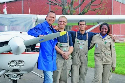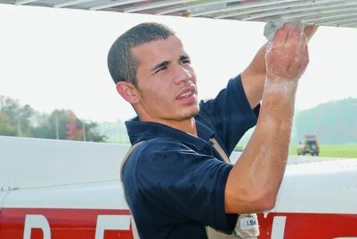Einsatzbesprechung: „Mwajoma, du kümmerst dich um den Innenraum. Simon und Ozan, ihr fangt mit mir vorne am Propeller an dann arbeiten wir uns Stück für Stück nach hinten.“ Methners Anweisung ist klar. Wichtig ist, die Arbeitsabschnitte genau einzuteilen, damit nicht eine Fläche vergessen und eine andere dafür doppelt gesäubert wird. André Methner sprüht die einmotorige Maschine mit einer Reinigungslösung ein. Von der Leiter aus erreicht er auch die Tragflächen. Jetzt schrubbt und wischt die Reinigungscrew gute fünf Stunden an dem Zweisitzer – gut, dass es kein Jumbojet ist. Anstrengend ist die Arbeit, das merkt man allen dreien an. Mwajoma hat in dem kleinen Cockpit nicht viel Platz, müht sich aber ehrgeizig, auch die letzte Ecke auszusaugen, um anschließend mit Kunststoffreiniger die Innenwände abzureiben. Ozan ist mittlerweile an den Unterseiten der Flügel angelangt und reinigt über Kopf. Der Fliegendreck ist hartnäckig. Glücklicherweise scheint die Herbstsonne heute kräftig und die Arbeit im Freien ist bei 20 °C richtig angenehm. Der Flughafen-Mechaniker hilft Simon noch mit einem fahrbaren Untersatz aus. Jetzt kann er relativ bequem den Bauch der Maschine reinigen.