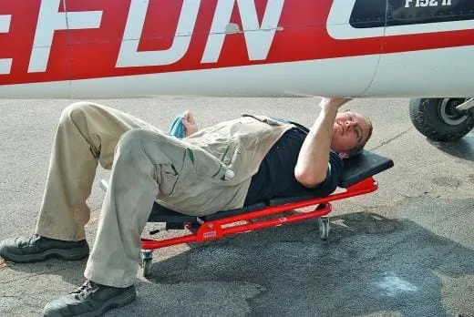 Simon freut sich über den „fahrbaren Untersatz“ des Flughafen-Mechanikers. Die Cessna soll schließlich auch von unten sauber werden.