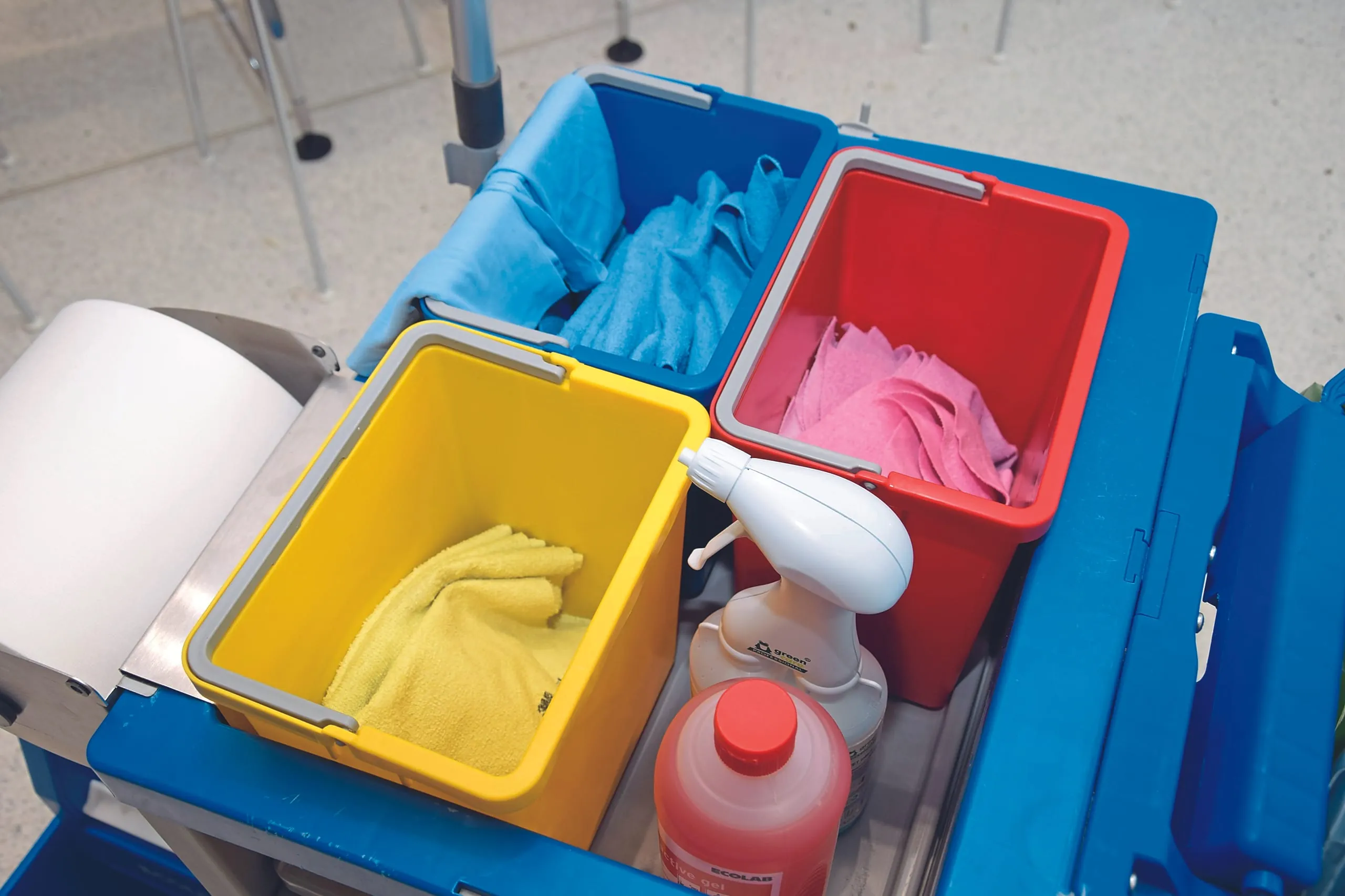 Bei einer Umstellung muss sichergestellt sein, dass auch die Reinigungswagen für die Boxen geeignet sind. Es gibt am Markt unterschiedliche Systeme. Die rechteckigen Boxen sollten einen dicht schließenden Deckel haben und stapelbar sein. Bei manchen Herstellern haben die Boxen einen gewölbten Boden, was das Einführen des Breitwischgerätes erleichtert.