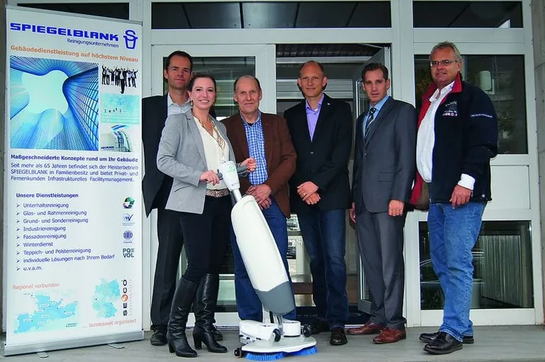 Als der erste Prototyp des i-Mop auf der CMS 2013 in Berlin vorgestellt wurde, waren die Besucher begeistert: Das Gerät vereint, kurz und knapp formuliert, die Vorteile eines Flachwischmopps und die eines Scheuersaugautomaten, ist universell einsetzbar auf großen und kleinen Flächen und kann mit einer Hand geführt werden. Zwei gegenläufige Bürsten sorgen für den Vortrieb, auch enge Kurven sind leicht und unkompliziert mit einer Hand zu fahren. Bei einem Gewicht von knapp 20 Kilogramm inklusive Tankinhalt (vier Liter Frischwasser) und Batterien ist der i-Mop (Arbeitsbreite 46 Zentimeter) leicht zu tragen und nicht nur auf der Fläche, sondern auch unter Tischen, Stühlen und Theken einsetzbar. Nach dem Einsatz kann das Gerät mit hochgeklapptem Bürstenkopf gekippt vom Einsatzort weggeschoben und platzsparend verstaut werden. Die Möglichkeiten, die der i-Mop bietet, überzeugten schon auf der CMS 2013 etliche Messebesucher und lösten einige Bestellungen aus, obwohl zum damaligen Zeitpunkt nicht klar war, wann die ersten Geräte ausgeliefert werden könnten. Zu den ersten Bestellern gehörte auch Spiegelblank aus Kiel, das Unternehmen von Bundesinnungsmeister Dieter Kuhnert. Ende September war es nun so weit: Juniorchefin Katharina Kuhnert und Arne Schade (Vertrieb Spiegelblank) konnten in Kiel endlich den ersten i-Mop in Schleswig-Holstein in Empfang nehmen. Übergeben wurde das Gerät von Geschäftsführer Kai Kruse (Henry Kruse GmbH & Co. KG), der in Begleitung von Key-Account-Manager Andreas Schlüter und zwei weiteren Mitarbeitern von Kruse/Igefa nach Kiel gekommen war. „Es ist schön, dass wir als einer der ersten Gebäudedienstleister den i-Mop nun auch in der Praxis einsetzen und auf Herz und Nieren prüfen können“, freute sich Katharina Kuhnert bei der Auslieferung des Gerätes in der Firmenzentrale von Spiegelblank.