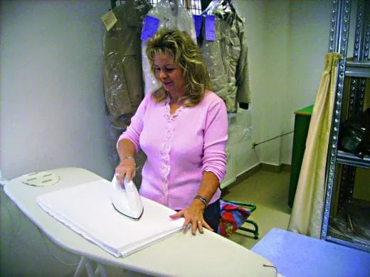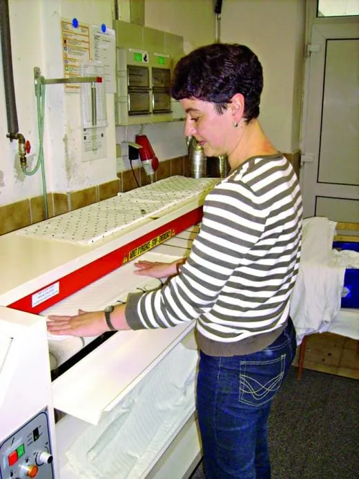 Heute pflegen vier Mitarbeiterinnen in zwei Schichten jede Woche durchschnittlich 1 t Wäsche. Das Spektrum reicht von Haushaltswäsche über Berufskleidung bis zu Tisch- und Bettwäsche für Kunden aus dem gesamten Regierungsbezirk Chemnitz. Ein Leasingservice für Damasttischwäsche von der Firma Kurt Bauer, Aue, ergänzt die Leistungspalette. In drei Waschschleudermaschinen von Electrolux mit Fassungsvermögen von 7, 10 und 12 kg können sowohl kleine als auch größere Mengen energie- und wassersparend gewaschen werden. Für Großaufträge wurde 2006 eine Grand-impianti-Waschschleudermaschine installiert. Der Unternehmer: „Sie hat eine Kapazität von 17 kg und ist mit Hightech ausgestattet. Deshalb können wir sogar Bettfüllungen waschen.“ Darüber hinaus werden die Maschinen auch für die Schmutzmattenreinigung sowie die Moppwäsche genutzt. Zwei Trockner von Electrolux (12 und 20 kg Fassungsvermögen) gewährleisten bei entsprechender Programmierung eine mangelgerechte Restfeuchte.