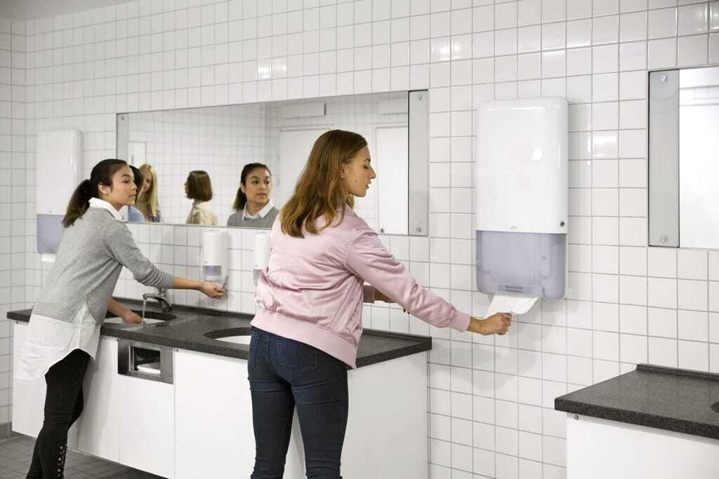 Bei stark beanspruchten Waschräumen sind die Seifen- und Papierhandtuchspender in Stoßzeiten schnell leer. Tork hat ein Spendersystem entwickelt, das Papierhandtücher schnell und unterbrechungsfrei ausgeben kann.