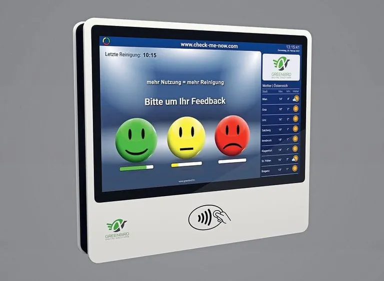 WC-Anlagen in Hotels, Flughäfen, Bürogebäuden, Bahnhöfen, Spitälern und Gastronomie werden häufig noch mit Hygienekontrolllisten aus Papier ausgestattet und diese von Reinigungskräften händisch ausgefüllt. Diese Blätter möchte Greenbird durch kleine Monitore mit Internetzugang (4G/WLAN/LAN) und batteriebetriebene Sensoren ersetzen und den Service der Sanitärräume vollständig automatisiert auslösen. Denn das österreichische Unternehmen hat sich einfach bedienbare Lösungen in den Bereichen Digital Signage und Digital Cleaning auf die Fahnen geschrieben. Mit dieser Lösung wird der Waschraumservice auf Basis der Personenzählung, mittels eines Intervalls und durch Nutzerfeedback beziehungsweise „Reinigungsanforderung“ ausgelöst. Zudem wird der Materialverbrauch, zum Beispiel von Seife und Toilettenpapier, erfasst. Die Verständigung des Reinigungspersonals erfolgt mittels auswählbarer Dienste beziehungsweise Apps wie Telegramm, WhatsApp, SMS oder E-Mail. Der Nutzer wierderum erkennt am Display, wann die letzte digitale Kontrolle beziehungsweise die letzte Reinigung stattgefunden hat.