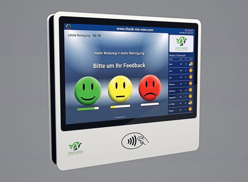 WC-Anlagen in Hotels, Flughäfen, Bürogebäuden, Bahnhöfen, Spitälern und Gastronomie werden häufig noch mit Hygienekontrolllisten aus Papier ausgestattet und diese von Reinigungskräften händisch ausgefüllt. Diese Blätter möchte Greenbird durch kleine Monitore mit Internetzugang (4G/WLAN/LAN) und batteriebetriebene Sensoren ersetzen und den Service der Sanitärräume vollständig automatisiert auslösen. Denn das österreichische Unternehmen hat sich einfach bedienbare Lösungen in den Bereichen Digital Signage und Digital Cleaning auf die Fahnen geschrieben. Mit dieser Lösung wird der Waschraumservice auf Basis der Personenzählung, mittels eines Intervalls und durch Nutzerfeedback beziehungsweise „Reinigungsanforderung“ ausgelöst. Zudem wird der Materialverbrauch, zum Beispiel von Seife und Toilettenpapier, erfasst. Die Verständigung des Reinigungspersonals erfolgt mittels auswählbarer Dienste beziehungsweise Apps wie Telegramm, WhatsApp, SMS oder E-Mail. Der Nutzer wierderum erkennt am Display, wann die letzte digitale Kontrolle beziehungsweise die letzte Reinigung stattgefunden hat.