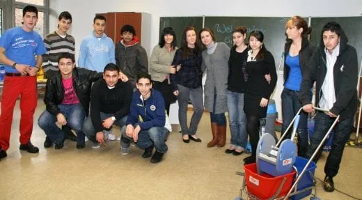 In der zweiten Gruppe gab es Action bei der maschinellen Fußbodengrundreinigung. Plötzlich wollten alle Schüler es selbst einmal ausprobieren und wischten, schrubbten und saugten begeistert ihr Klassenzimmer. Die Schüler waren sich einig: Das war eine interessante Lektion, bei der alle viel Spaß hatten und mit Überraschung feststellten: „Das macht ja voll Spaß cool, der Job.“