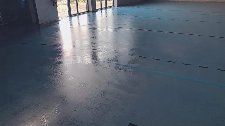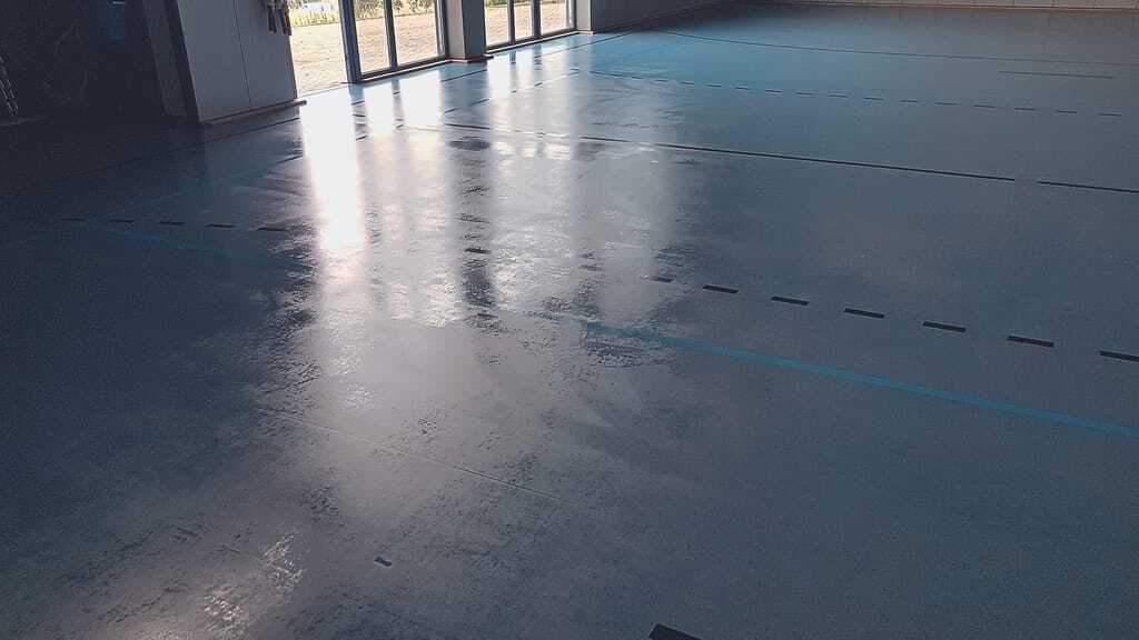 Um den Belag für die Einpflege mit einer Polymerdispersion vorzubereiten, wird der Belag einer Nassgrundreinigung unterzogen. Dazu wird ein geeigneter Grundreiniger (dosiert nach Herstellerangabe) auf den Belag aufgebracht. Nach einer Einwirkzeit von rund zehn Minuten werden die benetzten Bereiche mit einer geeigneten Scheuermaschine (zum Beispiel Einscheibenmaschine, Exenter- oder oszillierende Scheuermaschine) und untergelegtem grünen Pad (oder gleichwertig) gleichmäßig abgefahren. Hierbei ist zu beachten, dass die Grundreinigungslösung nicht antrocknet. Das Abfahren mit der Scheuermaschine darf nicht zu schnell erfolgen, da der Belag eine gleichmäßige Oberflächenbehandlung benötigt, um der Pflegedispersion ausreichend Haftung zu bieten. Anschließend wird die Schmutzflotte mit Nasssauger/Scheuersaugmaschine aufgenommen und mit klarem Wasser gespült. Nach der Grundreinigung muss der Belag frei von allen Rückständen sein.