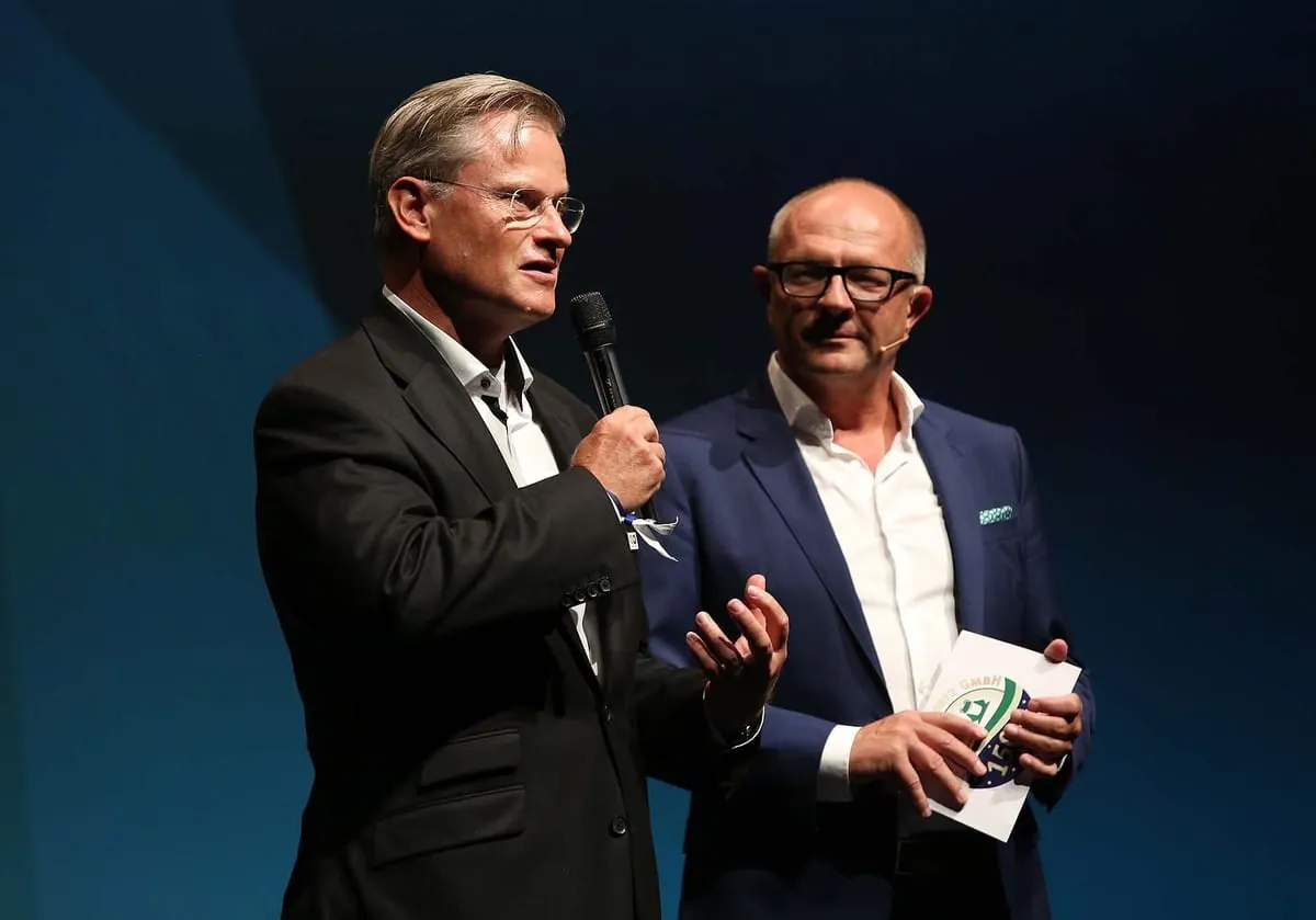 Reinhard Schneider (li.), geschäftsführender Gesellschafter von Werner & Mertz, und Moderator Stefan Schulze-Hausmann begrüßten rund 850 Mitarbeiter aus ganz Europa.