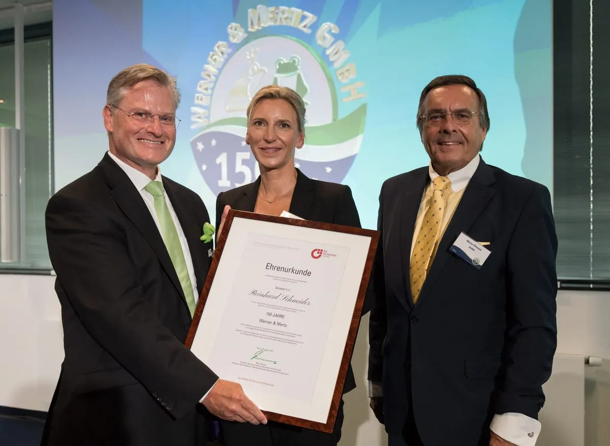 Bereits einige Tage vor dem Mitarbeiterfest hatte Werner & Mertz  zum Auftakt der mehrtägigen Feierlichkeiten zahlreiche Vertreter aus Wirtschaft, Politik und Verbänden am Firmensitz begrüßt. Mario Ohoven, Präsident des Bundesverbands für Mittelständische Wirtschaft (BVMW), zeichnete Reinhard Schneider, Senator h.c. im BVMW, dabei mit einer Ehrenurkunde „für das unermüdliche Engagement für den deutschen Mittelstand“ aus. / HH