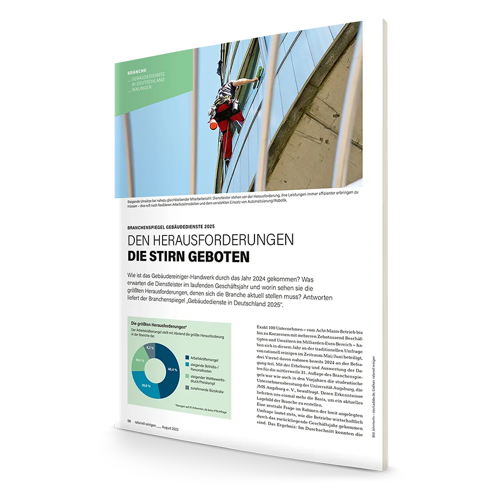Wie ist das Gebäudereiniger-Handwerk durch das Jahr 2024 gekommen? Was erwarten die Dienstleister im laufenden Geschäftsjahr und worin sehen sie die größten Herausforderungen, denen sich die Branche aktuell stellen muss? Antworten liefert der Branchenspiegel "Gebäudedienste in Deutschland 2025".