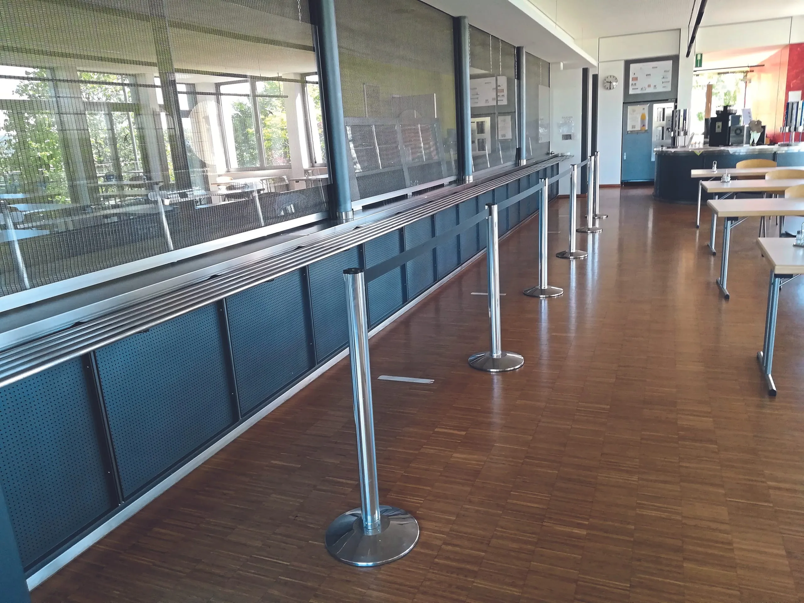 Das Pflegen und Erhalten funktioniert nicht nur bei beschichteten Böden, sondern auch bei Parkett – hier in einer Mensa.