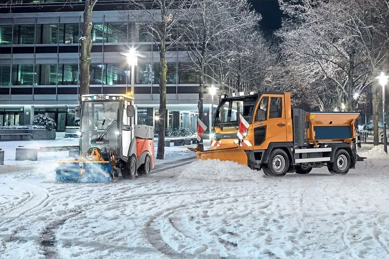 Zeichnet sich eine schneereichere oder auch kältere Wetterlage ab, lassen sich verschiedene Geräteträgermodelle einfach und schnell umrüsten. Anstelle der Kehrmaschine wird im vorderen Anbauraum oder am Frontlift ein Schneeschild angebracht und hinter der Kabine ein passender Streuaufbau aufgesattelt.